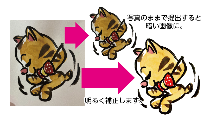 手描きで描いたアバターを写真で撮って申請する場合、色補正を行っておかないと全体に暗くなってしまいます。