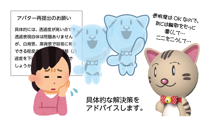 審査結果と提出したアバターを拝見して、どこをどう直していけば通りやすいか具体的にアドバイスをします。